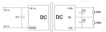 3.推荐电路:若要求进一步电源模块减少输入输出纹波,可在电源模块输入输出端连接一个电容滤波网络,应用电路如下图所示。