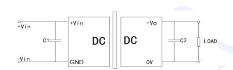3.推荐电路:若要求进一步减少模块电源输入输出纹波,可在模块电源输入输出端连接一个电容滤波网络,应用电路如下图所示。