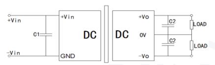 3.推荐电路:若要求进一步减少模块电源的输入输出纹波,可在模块电源输入输出端连接一个电容滤波网络,应用电路如下图所示。